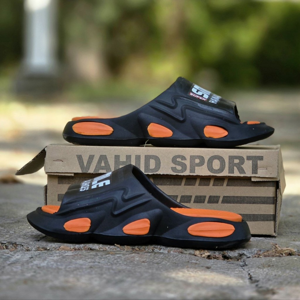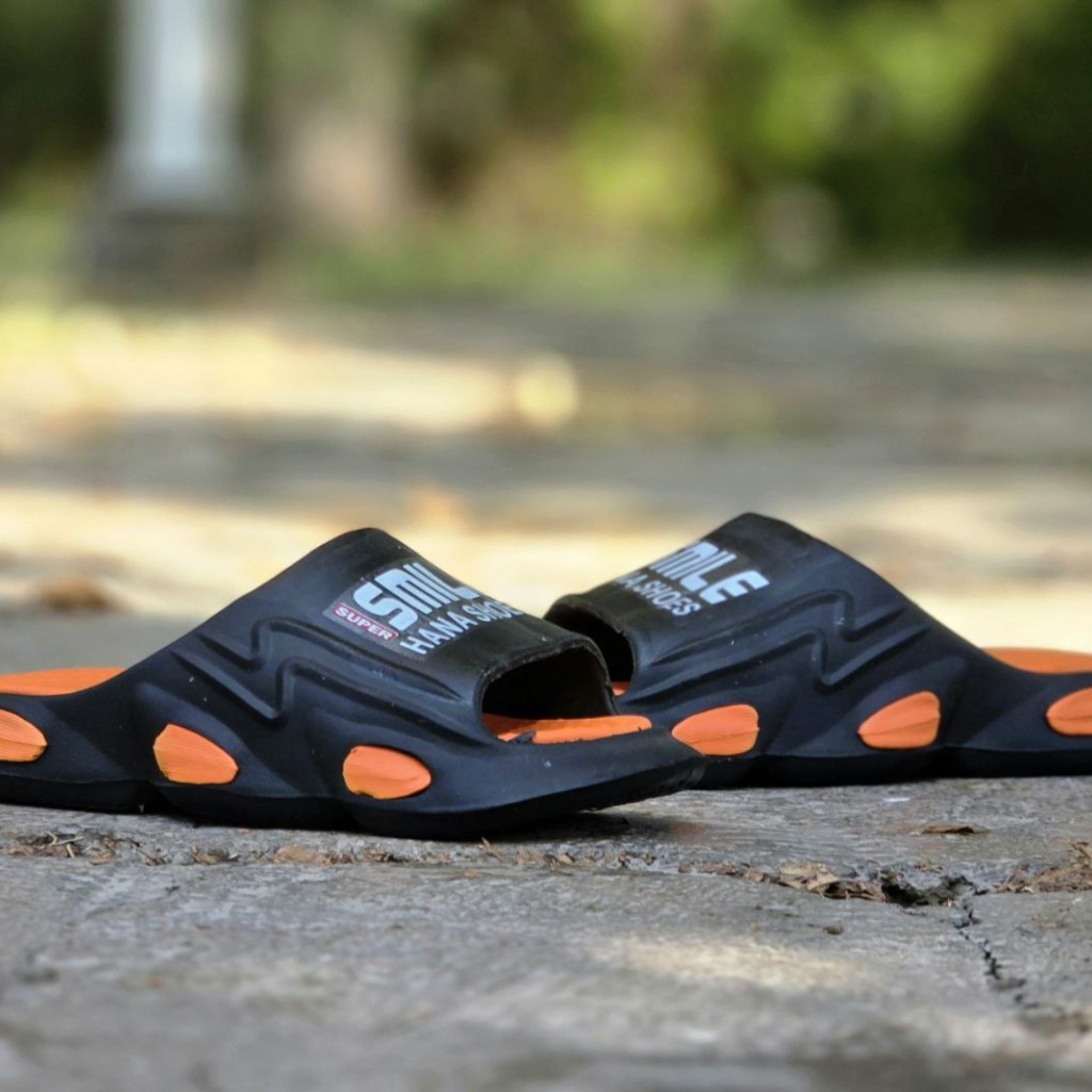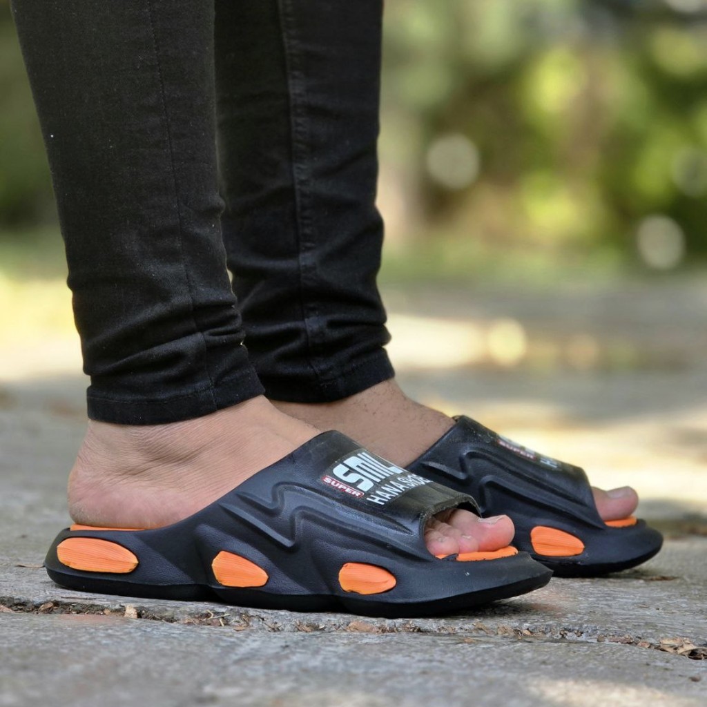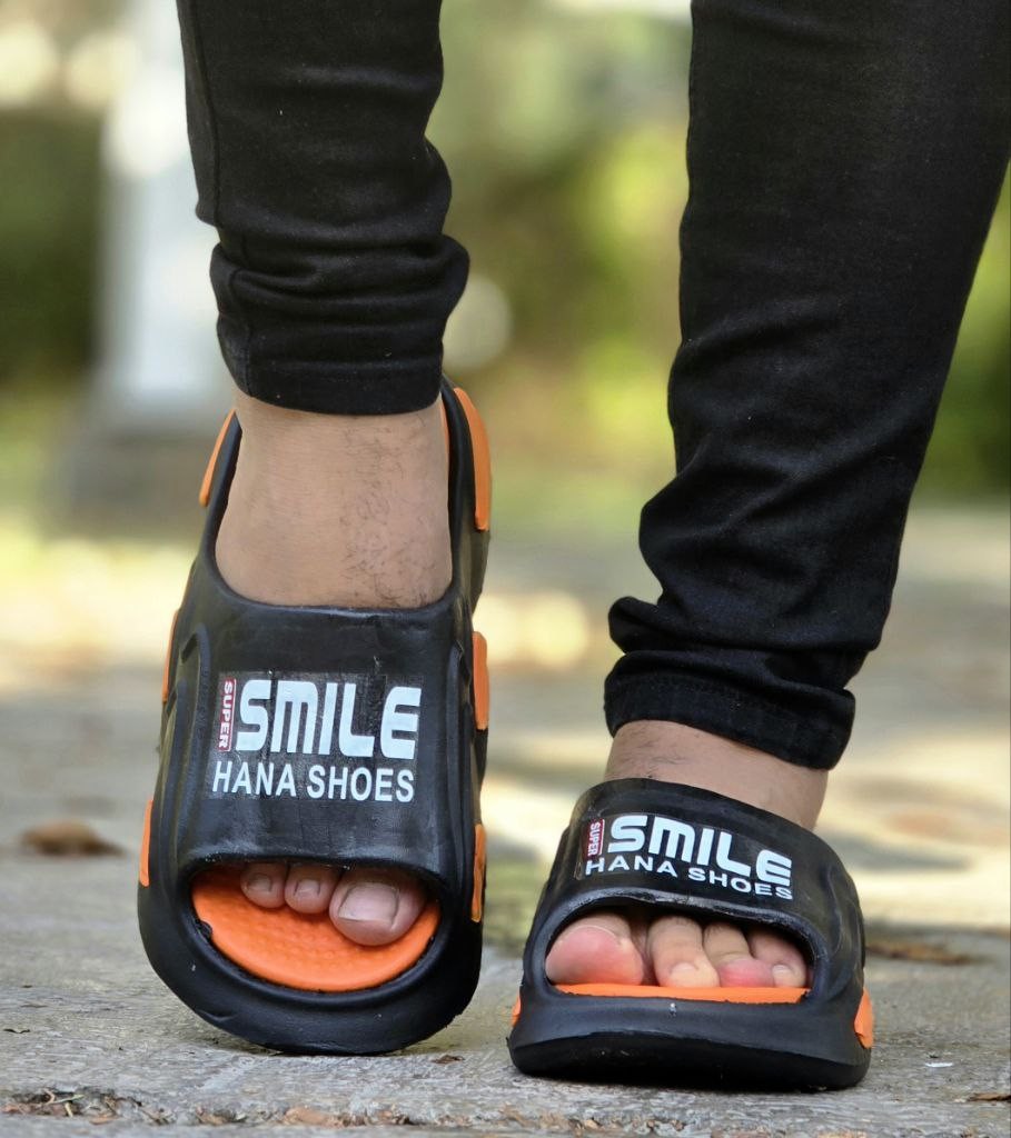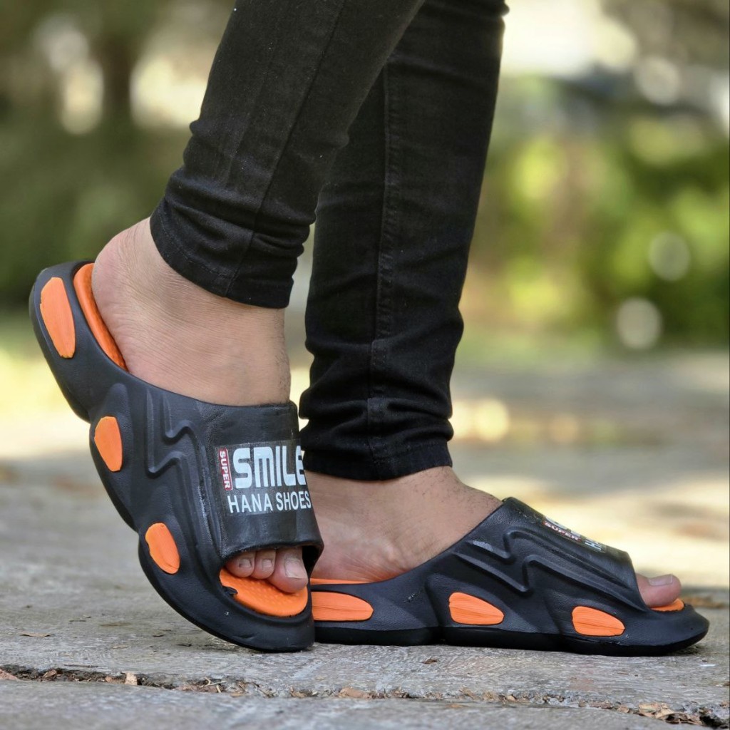 فروش شگفت انگیز دمپایی صندل مردانه پسرانه مدل فشیون طرح smile چشم گیر و اصیل رنگ مشکی نارنجی باارسال رایگان